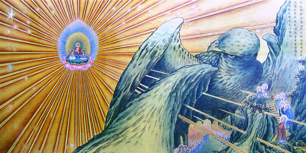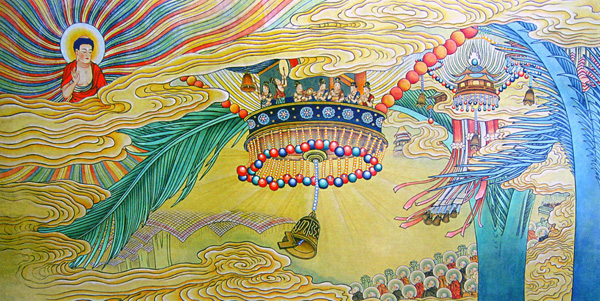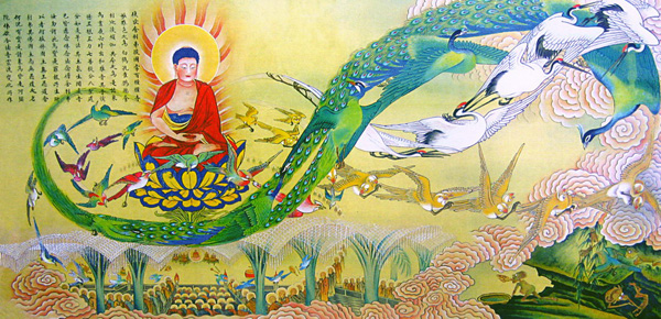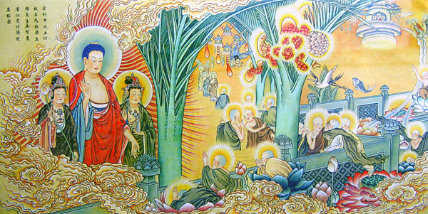 這時,佛陀告訴長老舍利弗說:在這世界的西方,越過十萬億佛土有一個世界叫做極樂國。那裡有一尊佛叫阿彌陀佛,現在正在說法。