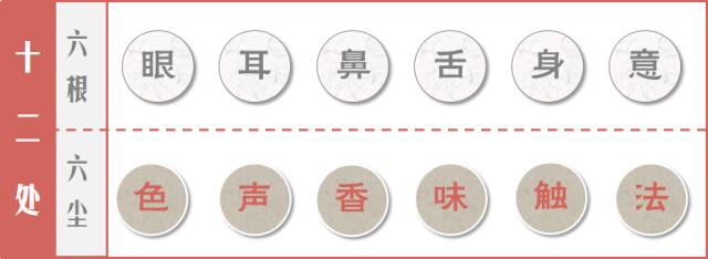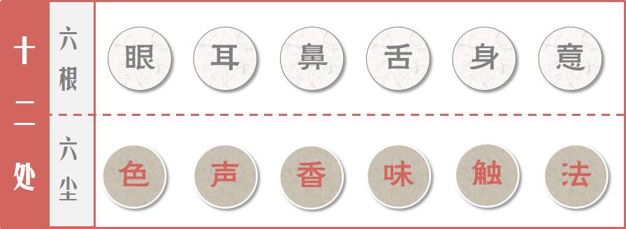所謂十二處,即眼、耳、鼻、舌、身、意六根,和色、聲、香、味、觸、法六塵。在六根接觸六塵時,眼睛看到色彩,耳朵聽到音聲,鼻子聞到氣味,舌頭嚐到味道…… 由根塵的和合,構成我們的認識和各種心理活動。